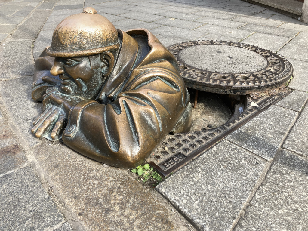 Ein in seiner künstlerischen Aussage sehr ähnliches Denkmal mit Namen „Čumil“ (Deutsch „Gucker“) befindet sich seit 1997 in Bratislava. Über der Bronzeplastik befindet sich ein Schild mit der Aufschrift „Man at work“.