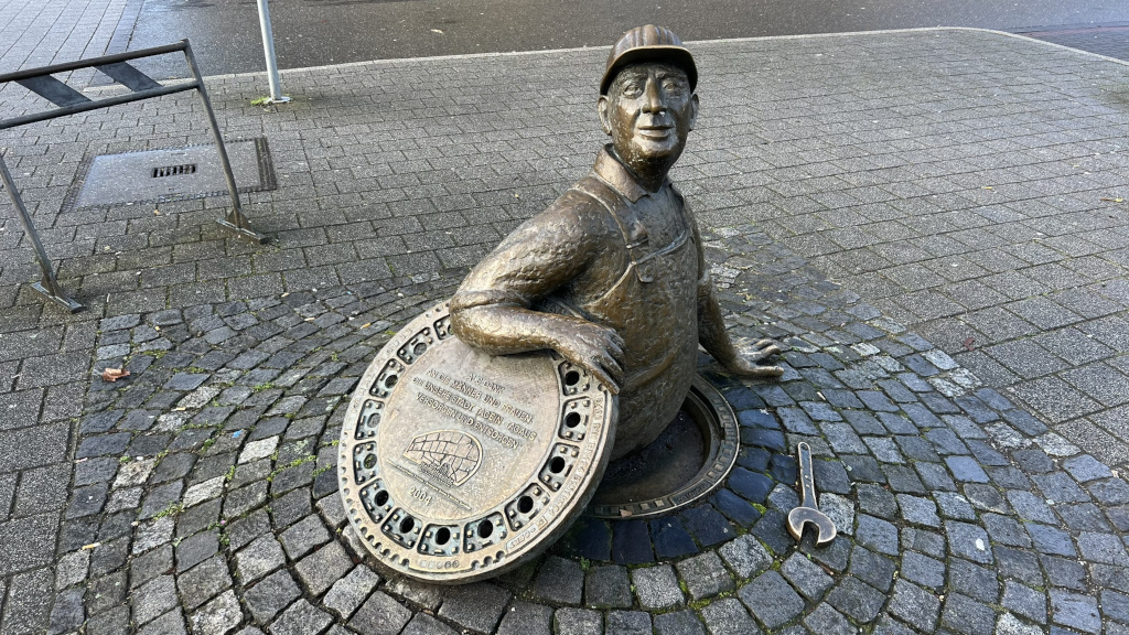 Dies ist eines der ungewöhnlichsten Denkmäler in der Stadt Neuss. Ein Mann mittleren Alters scheint gerade aus einem Kanalschacht auszusteigen und schaut uns dabei freundlich an. Wer ist dieser Mann?
