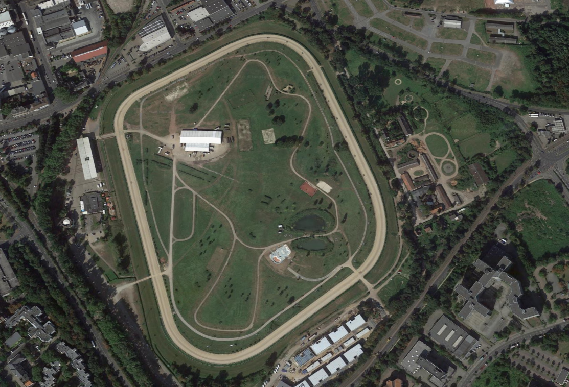 Beitragsbild: Luftaufnahme aus Google Earth aus dem Jahr 2016. Deutlich erkennbar ist das Geläuf, die Führringe und diverse Wirtschaftsgebäude.